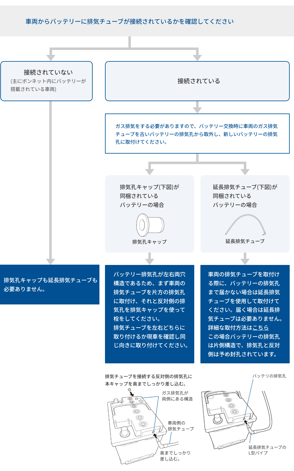 バッテリー本体のガス排気孔が片穴構造のバッテリーには延長排気チューブを同梱しています。
