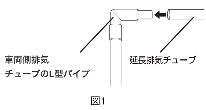 1. 延長排気チューブを車両側排気チューブのL型パイプに差し込んでください。(図1)