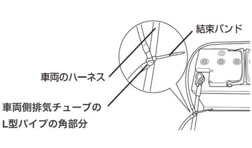2. 車両側排気チューブのL型パイプの角部分を車両のハーネス等に同梱の結束バンドで固定してください。