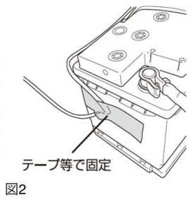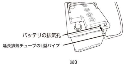 ※車両側排気チューブのL型パイプが車両のハーネス等に届かず固定できない場合は、L型パイプをバッテリー本体にテープ等でしっかり固定してください。(図2)