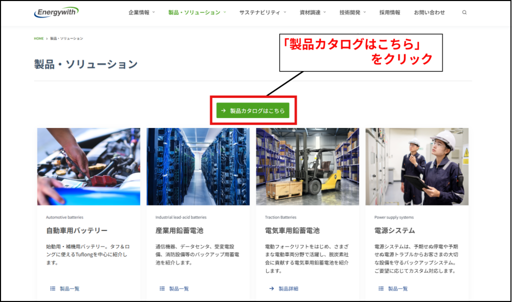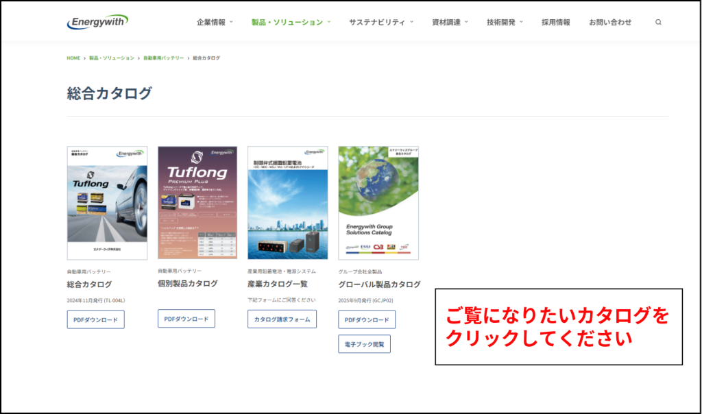 以下のリンク、もしくはTOPページ、製品・ソリューションページ(画像参照)からカタログ一覧ページ(一番下の画像)に遷移できます。