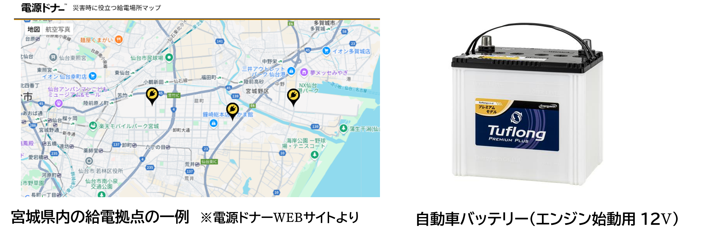 災害時に停電した際、自動車バッテリーから電気を確保して地域住民に無償提供する給電拠点(※電源ドナー)に新たに参加する、仙台市宮城野区にある中古車販売店『タックス宮城野』において、エナジーウィズ株式会社(東京都千代田区、代表取締役社長:吉田誠人)は株式会社イーコース(東京都中央区、代表:菊竹玉記)が主催する電源供給の公開実験会に参加し、自動車バッテリーからどれだけの電気が供給できるか公開実験を行います。