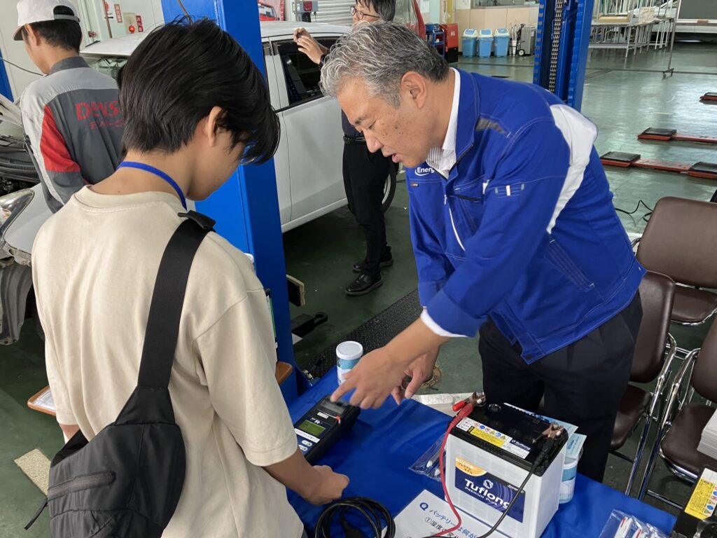 訪れた人には、自動車バッテリーに関する4択クイズなどを通じて基礎情報を知っていただいたほか、テスターを使ってバッテリーの充電状態を確認する電圧測定を体験していただきました。体験を通して、オープンキャンパス参加者などからは「自動車のバッテリーの大切さが分かった」、在校生からは「テスターの使い方が理解できた」などの声をいただきました。