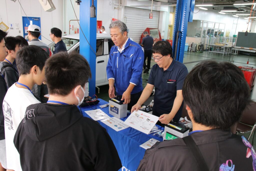 『赤門学院祭』には、在校生を含めて約500人が参加しました。エナジーウィズは、自動車バッテリーに関する作業を体験することができるブースを設け、同校に入学を予定・検討している人や在校生などの未来の自動車整備士たち約50人が訪れました。