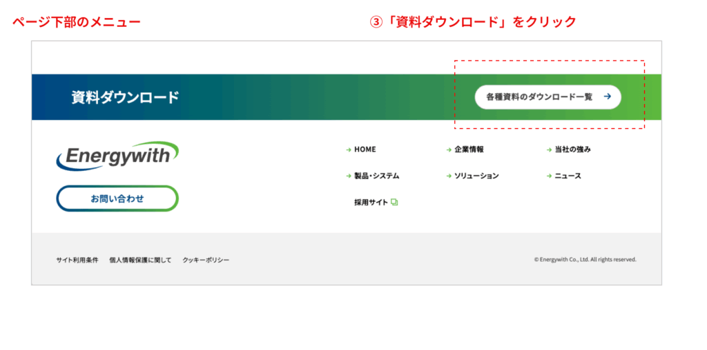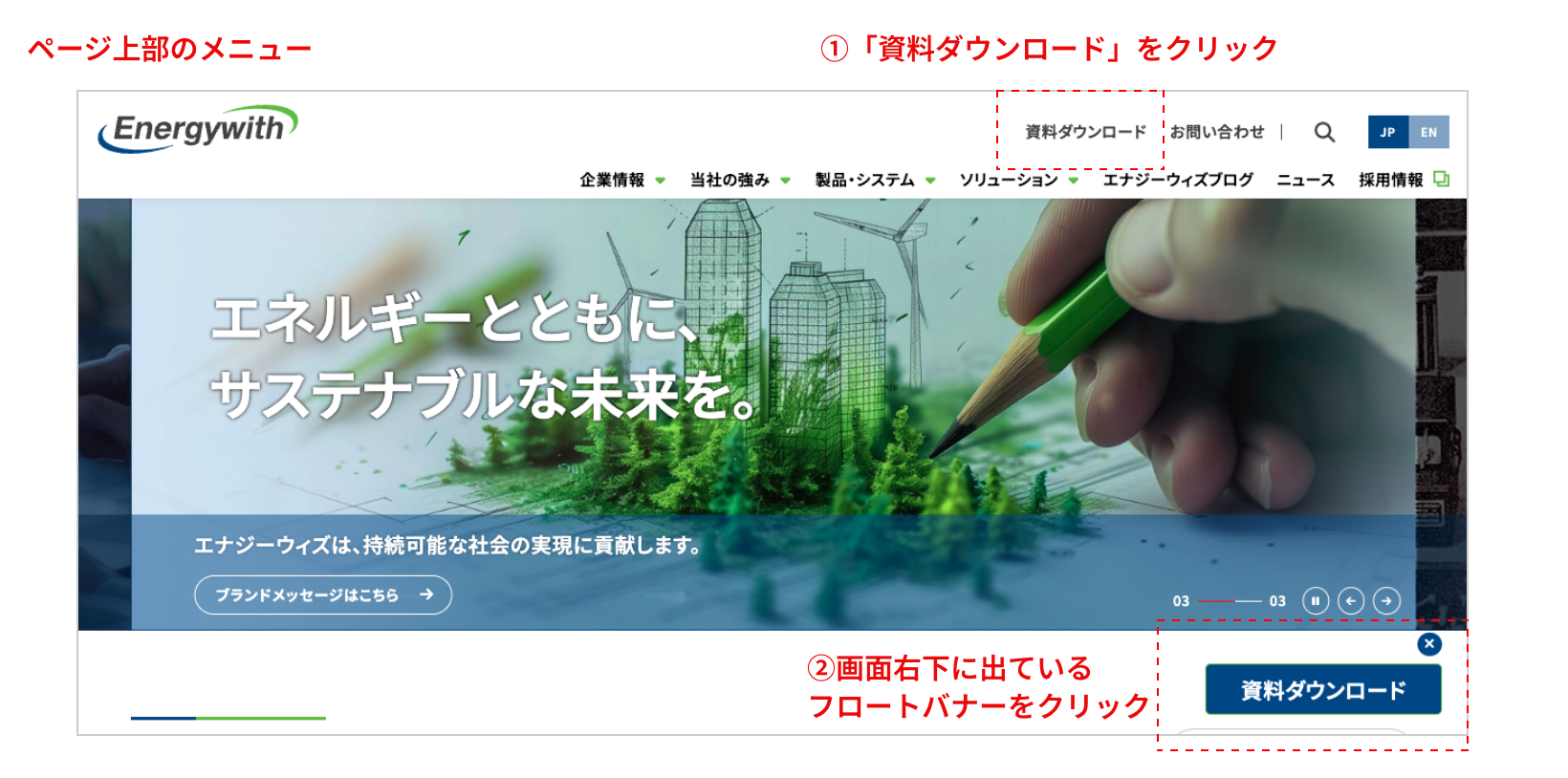 各ページの①上部メニュー、②フロートバナー、③下部メニューいずれかの方法で資料ダウンロードページへ遷移できます。