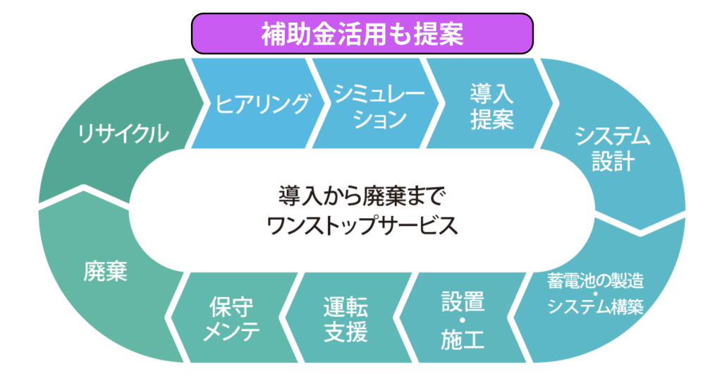 エナジーウィズは、再エネ設備と併設する蓄電システムの導入、運用に関するすべてのステップを、グループ内で一貫して提供する、ワンストップサービスを提供しています。