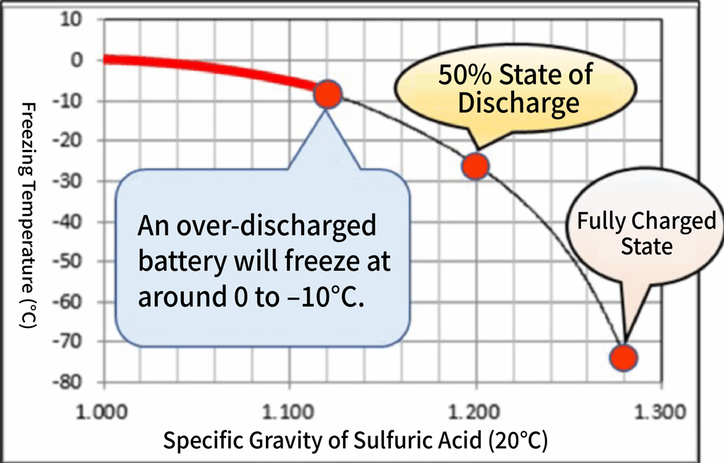 Freezing occurs when certain conditions align, and two major factors behind this are the battery’s state of charge (electrolyte specific gravity) and ambient temperature.