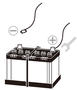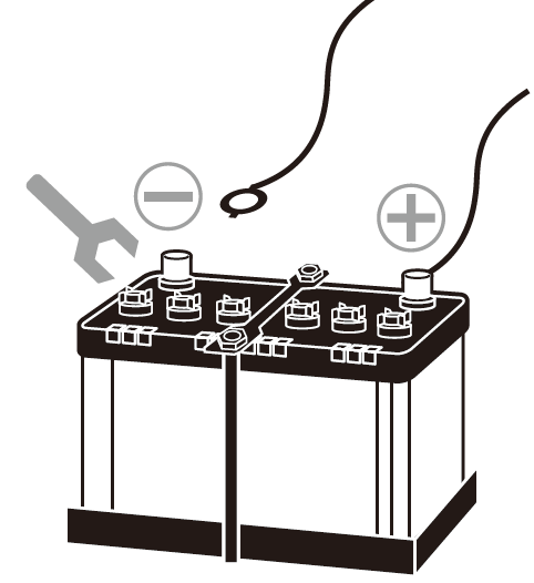 - First, loosen the nut on the vehicle-side negative (–) cable terminal (including cases where two terminals are installed), and remove the cable terminal from the battery’s negative terminal. (Figure 2)