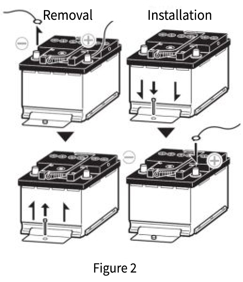 - Loosen the battery mounting bracket and remove the battery while keeping it level. (Figure 2)