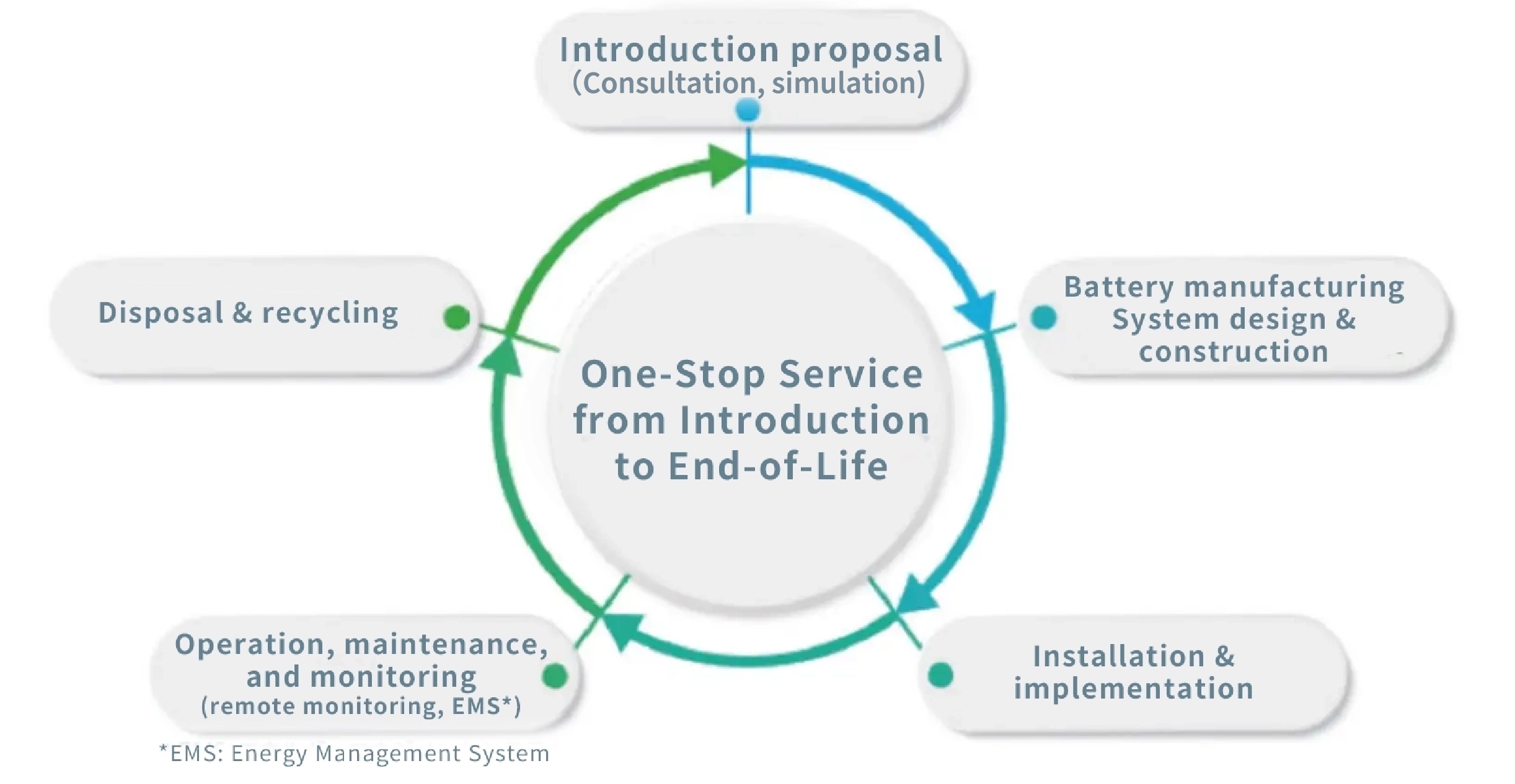Rather than stopping at product supply, Energywith supports every stage—from initial proposal and system design to installation, operation, maintenance, and end-of-life disposal/recycling. With deep knowledge and technical strength in storage batteries, we aim to be a partner who offers both reliability (“you can leave it to us”) and expertise (“we propose optimal solutions”), contributing to a decarbonized and circular society.