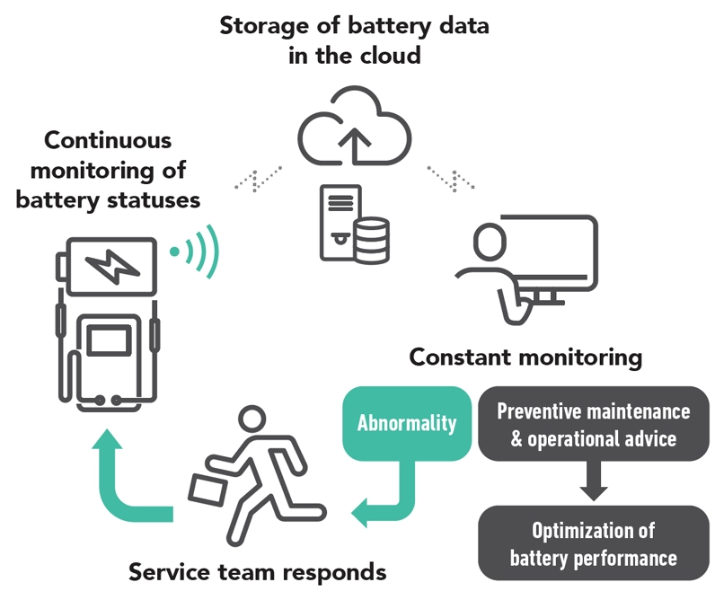 The system continuously monitors battery conditions via the cloud, enabling quick detection of abnormalities and rapid response from our service team.