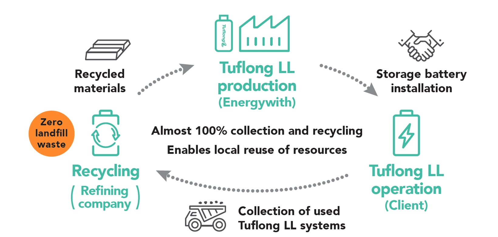 Energywith’s Tuflong LL batteries are collected under the national wide-area certification scheme and achieve an exceptionally high material recovery rate—nearly 100%. The recovered lead, resin, and other materials are reused as recycled raw materials by domestic smelters, forming a closed-loop recycling system. This approach minimizes waste generation and reduces CO₂ emissions* to less than half compared to using newly mined raw materials. By maintaining domestic circulation, the system ensures both stable supply and short lead times, delivering an environmentally responsible and highly sustainable energy storage solution.
