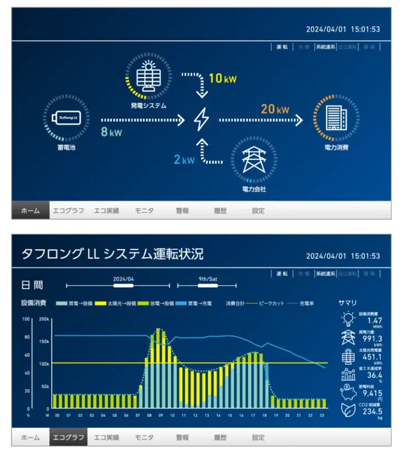 The Tuflong LL system provides real-time visibility of generation, purchased electricity, and the battery’s charge/discharge status through its standard display software. With numerical and graphical views of energy flow, users can quantify reductions in purchased electricity and CO₂ emissions and optimize the system while clearly seeing the effects of installation.