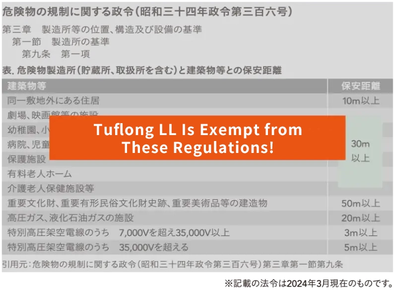 ――Unlike lithium-ion or NaS batteries, Tuflong LL contains no hazardous materials and is therefore not subject to fire-service safety distance regulations.