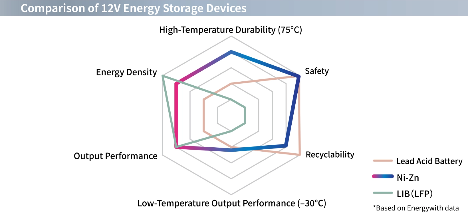 Ni-Zn batteries offer higher energy density than lead-acid batteries and can be made lighter. Although short service life had traditionally been a challenge, we have significantly improved durability through advancements in separators and electrolytes.