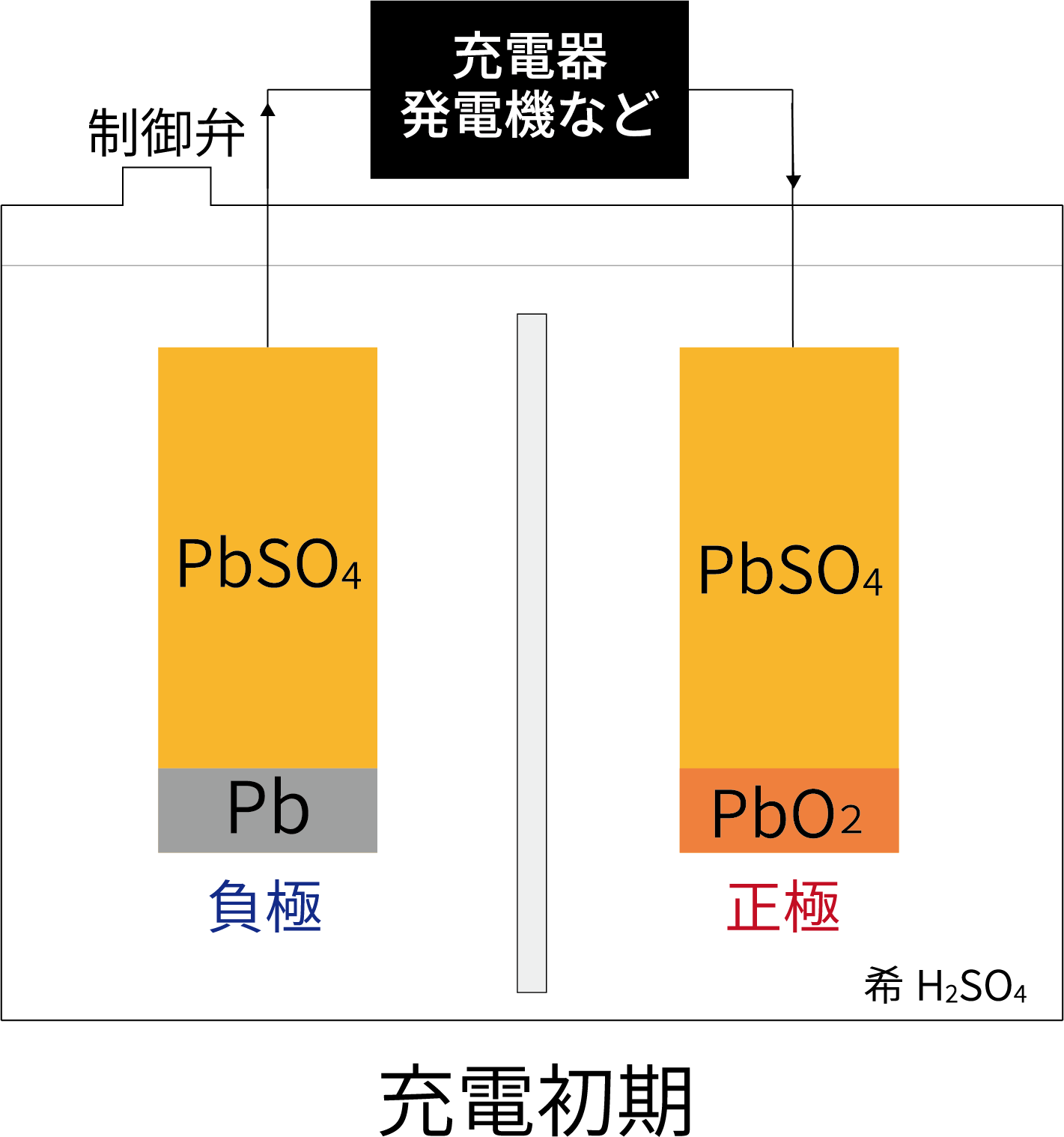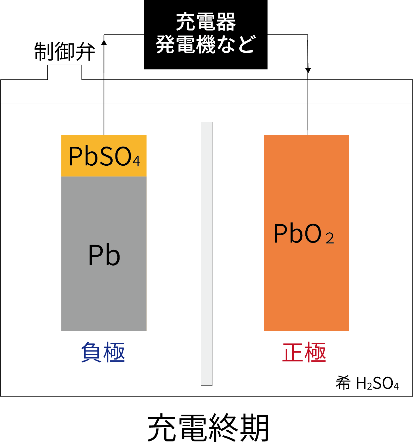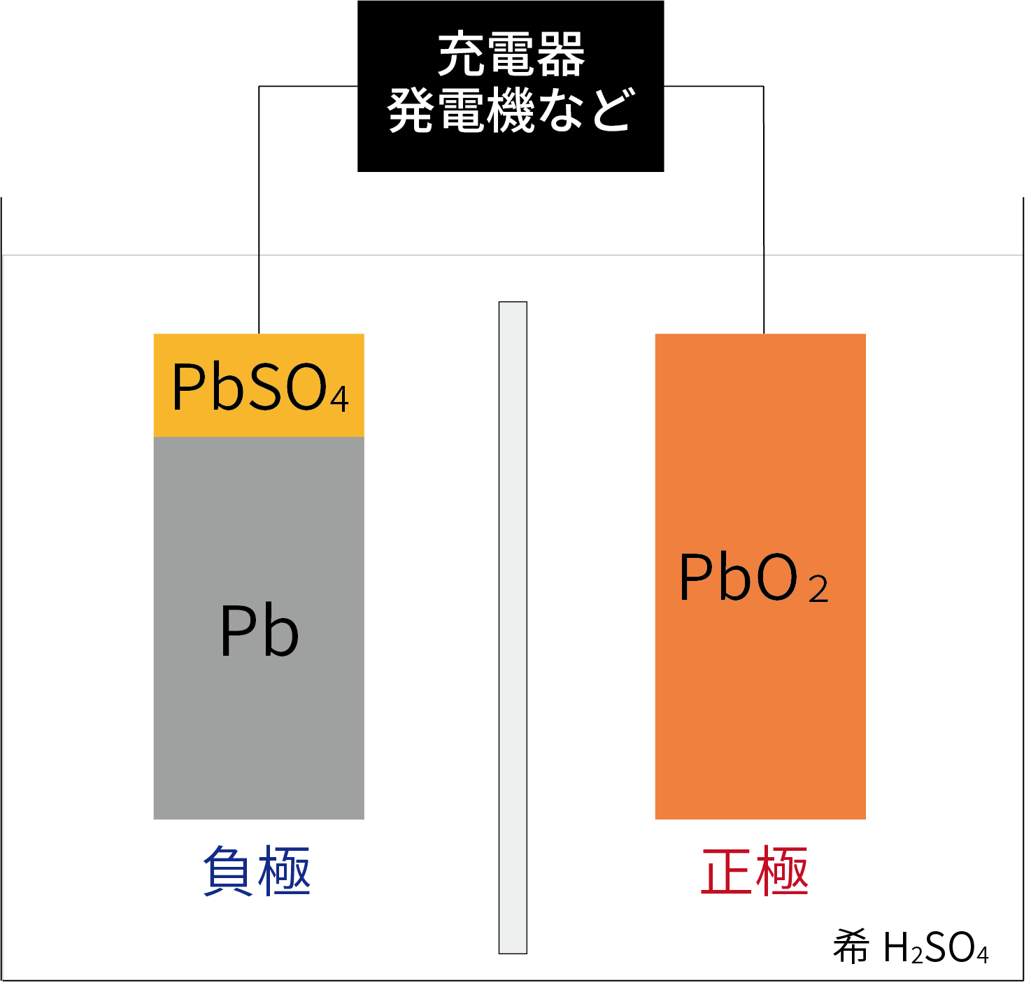 充電によって、正極はPbO2、負極はPbに変化する。
