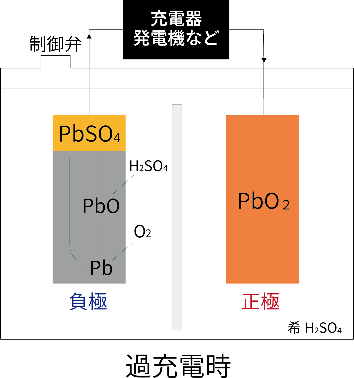 O2ガスは負極のPbと反応し、PbOを生成するが、直ちにH2SO4と反応して、PbSO4とH2Oを生成する。