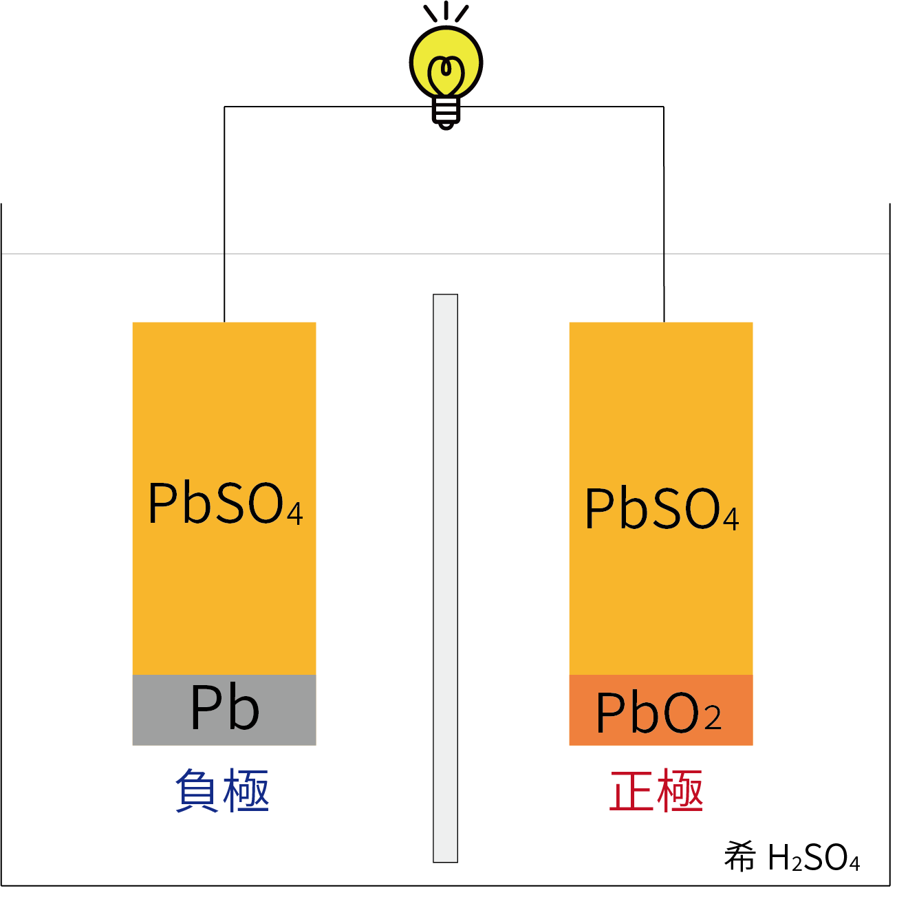 放電により、正極・負極ともにPbSO4が生成し、H2Oも生成する(電解液の濃度が薄くなる)。
