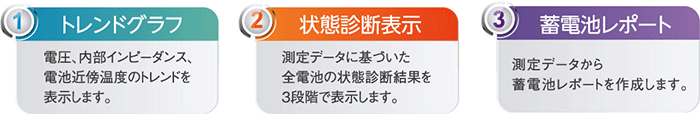 上位コントローラ(オプション)で蓄電池測定データ(電圧・内部インピーダンス・電池近傍温度)の保存、CSVファイル出力、トレンドグラフ・状態診断表示・蓄電池レポートで測定データの可視化を実現します。