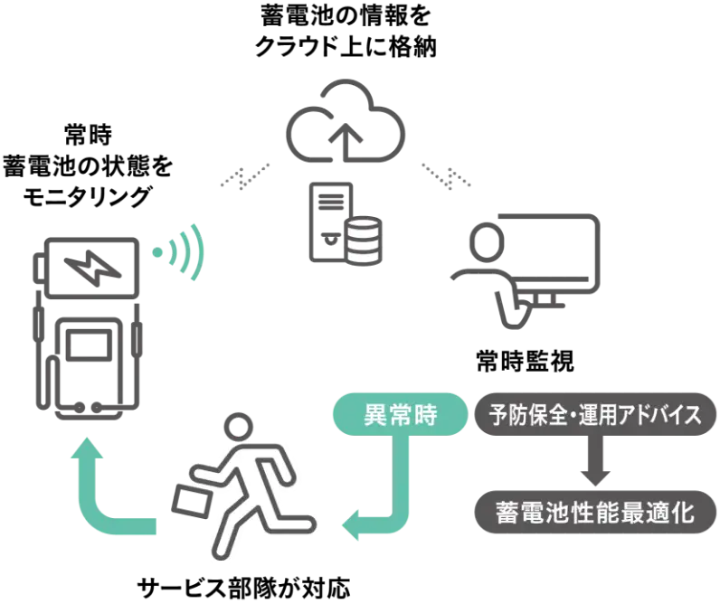 常時クラウド上で蓄電池の状態をモニタリングしているため、異常を迅速に検知し、サービス部隊が速やかに対応します。