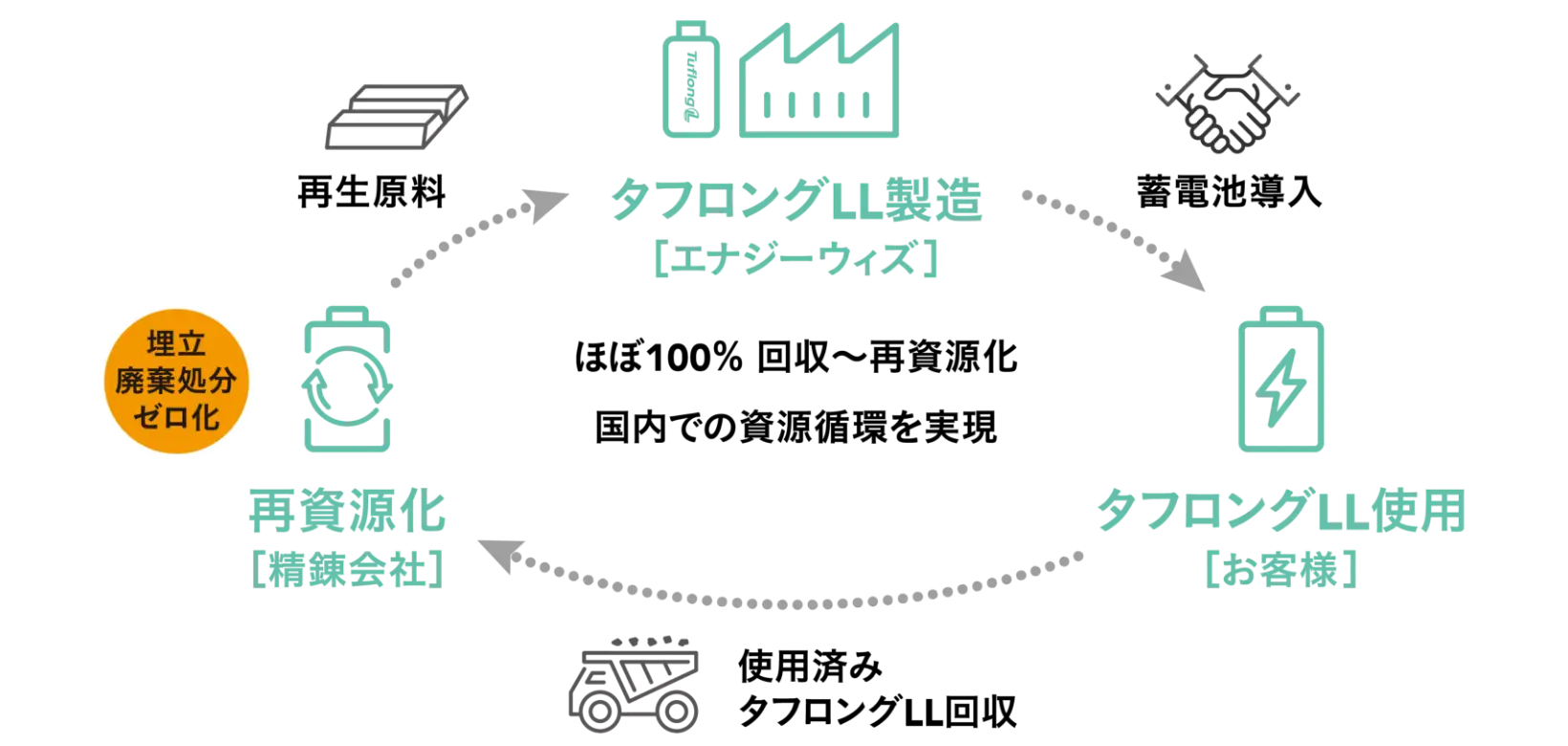 エナジーウィズの蓄電池「タフロングLL」は、使用済み製品を広域認定制度のもとで回収し、ほぼ100%の再資源化を実現。回収された鉛や樹脂などは国内の精錬会社で再生原料として再利用され、資源を循環させる仕組みを確立しています。これにより、廃棄物の発生を最小限に抑えるとともに、鉱物由来の新材を使う場合に比べてCO₂排出量※を半分未満に削減。国内循環による安定供給と短いリードタイムを両立し、環境負荷の少ないサステナブルな蓄電ソリューションを実現しています。