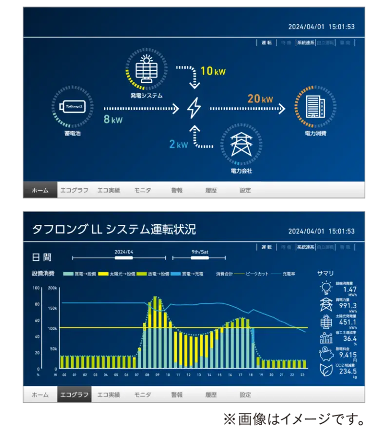 タフロングLLシステムは、発電・買電の状況や蓄電池の充放電レベルをリアルタイムで可視化。