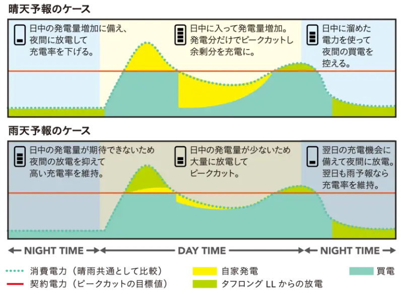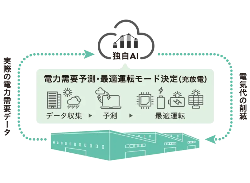 余剰電力を蓄え、不足時に活用することで、基本料金・従量課金の両面から電気代を削減。独自のシミュレーションと需要予測モデルにより、太陽光・風力発電と連携して効率的に運転し、天気の変化にも自動対応します。