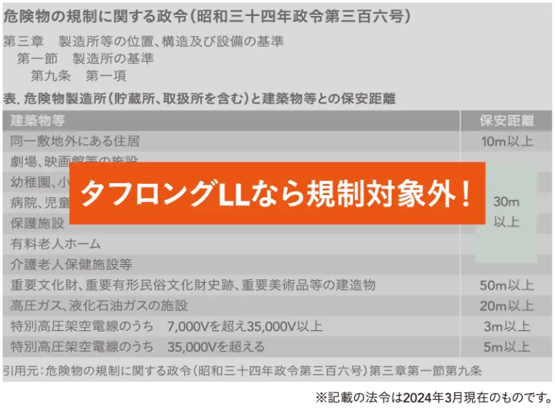 タフロングLLは常温設置が可能で、また、消防法上の危険物に該当しない素材で構成されており、危険物の規制による制約を受けません。その優れた取扱性により、設置場所や環境条件を問わず柔軟な導入ができます。実際に、以下のような多様な設置事例があります。
