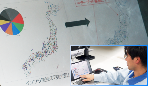 営業活動も『データドリブン』に。インフラ設備等に関する公開情報を生成AIで自動収集。自社の蓄電池販売データと照合してマップに表示し、営業機会が「どこに」「どのくらい」あるかを事業部と営業部が直感的に情報共有しています。