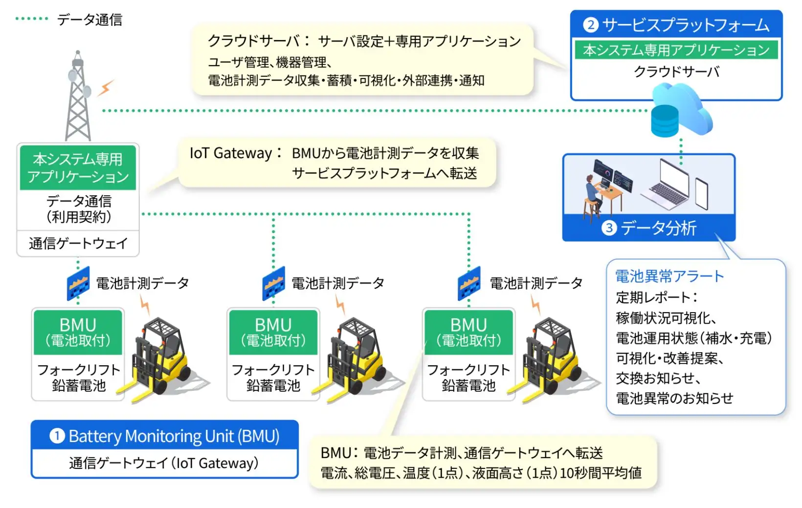 BMU(Battery Monitoring Unit)で電流、総電圧、温度、液面高さを自動計測、電池計測データは通信ゲートウェイ(IoT Gateway)を介してサービスプラットフォームへ転送されます。サービスプラットフォームでは蓄積した電池計測データを基に電池異常のお知らせおよび定期レポートを生成、サービスとして提供しています。